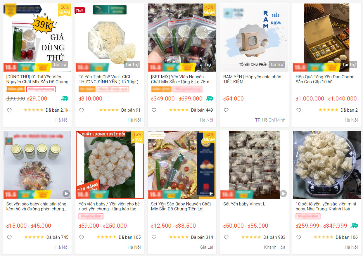 Các sản phẩm, yến có giá rẻ đến khó tin, không có thương hiệu hay nguồn gốc rõ ràng hiện được bày bán tràn lan trên mạng (ảnh chụp màn hình).